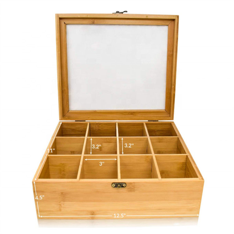 पारदर्शी ढक्कन वाला लकड़ी का बक्सा 12 डिब्बे लकड़ी चाय बॉक्स आयोजक 0