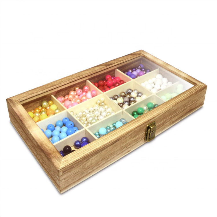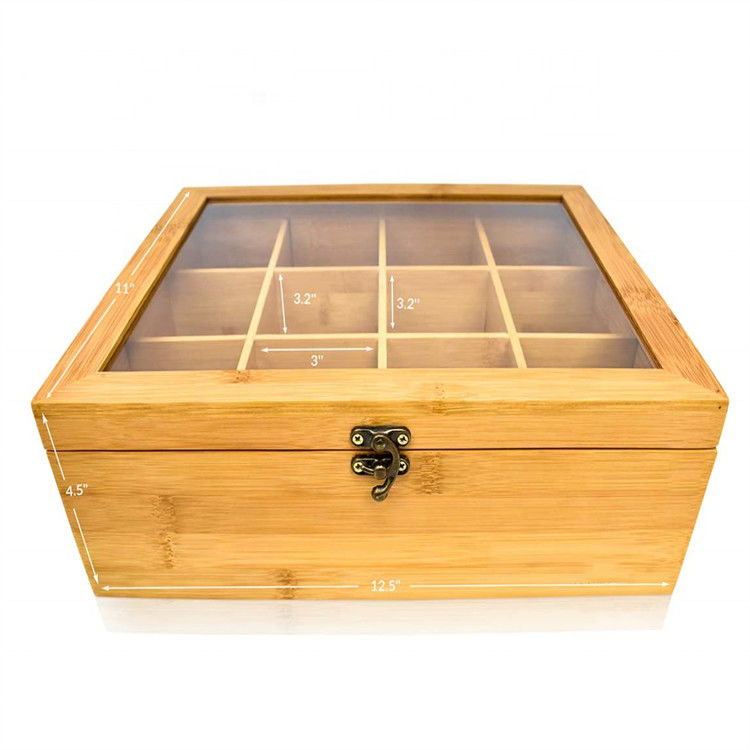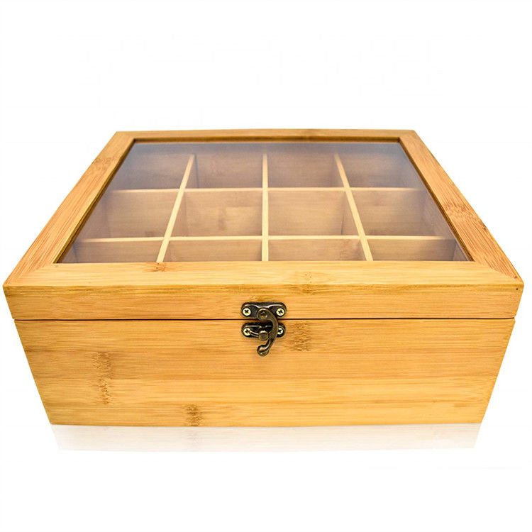 पारदर्शी ढक्कन वाला लकड़ी का बक्सा 12 डिब्बे लकड़ी चाय बॉक्स आयोजक