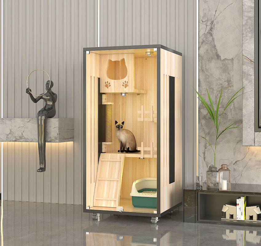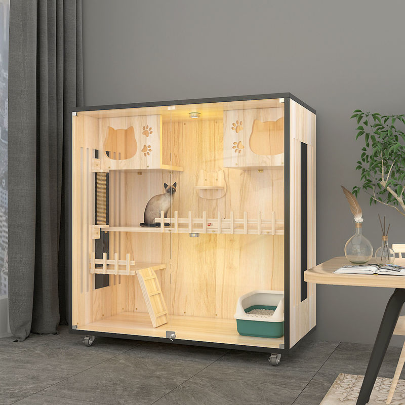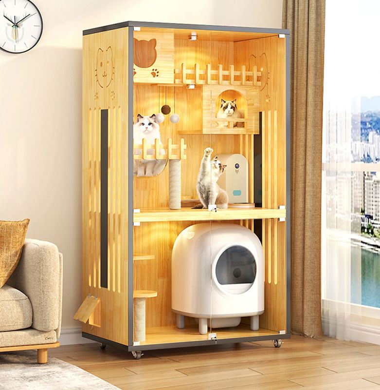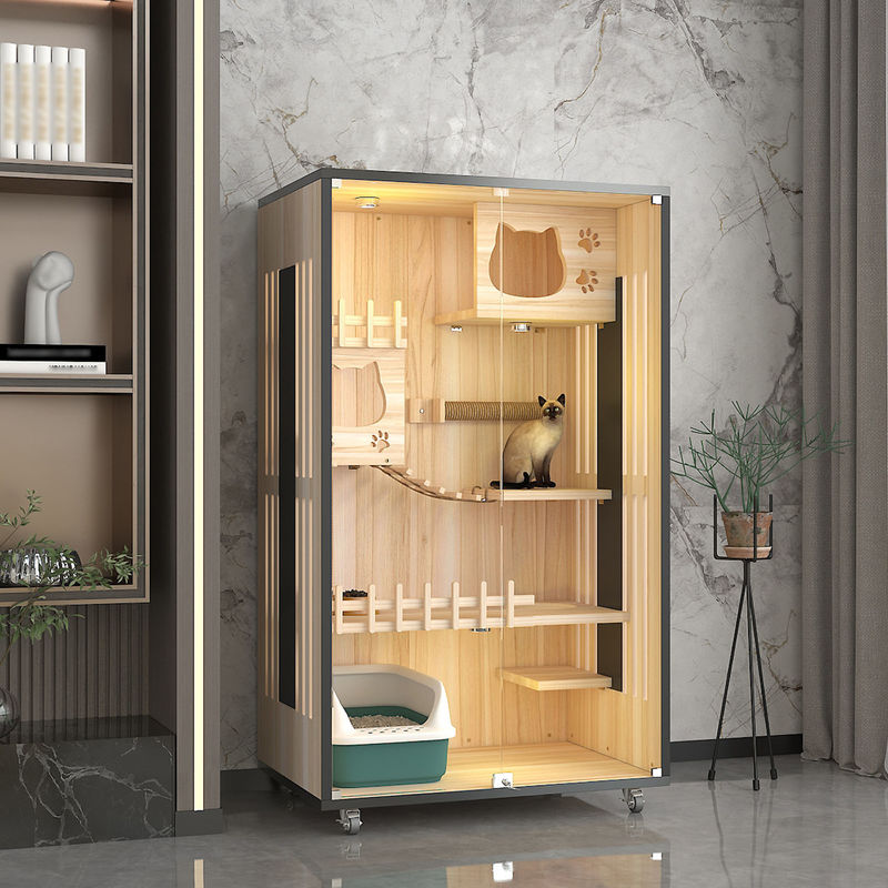 व्हील कैट कैबिनेट कैट विला किटन हाउस सॉलिड वुड मल्टी-लेयर कैट क्लाइंबिंग रैक किटन फर्नीचर के साथ लकड़ी की पालतू जानवर की दुकान