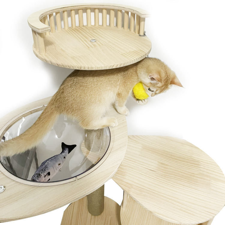 फ़ैक्टरी लक्जरी बड़े आकार का हल्का पीला आधुनिक लकड़ी का पालतू फर्नीचर कैट टॉवर हाउस स्क्रैचर पेड़