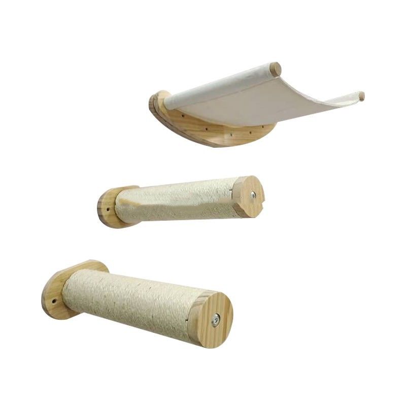 क्लाइम्बिंग पोल या क्लॉ बोर्ड: बिल्लियों के लिए अधिक मनोरंजन और व्यायाम के अवसर प्रदान करने के लिए दीवार पर लगे कैट क्लाइंबिंग फ्रेम संयोजन को क्लाइंबिंग पोल या क्लॉ बोर्ड से सुसज्जित किया जा सकता है।चढ़ने वाले खंभे और स्क्रैचिंग बोर्ड आमतौर पर लकड़ी की सामग्री से बने होते हैं, जो बिल्ली के मनोरंजन और गतिविधि को बढ़ाते हैं।