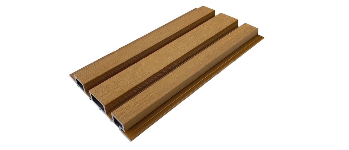 बाहरी सजावट सह एक्सट्रूज़न 140 * 25 मिमी लकड़ी के प्लास्टिक समग्र 3 डी डब्ल्यूपीसी दीवार पैनल